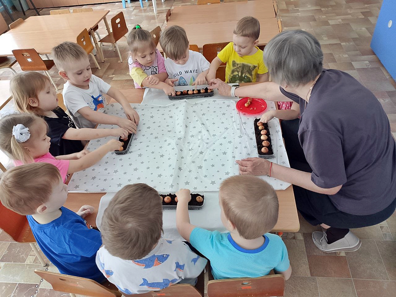 Посадили лук, посеяли укроп и даже помидоры! Так в группе появился свой огород на окне.