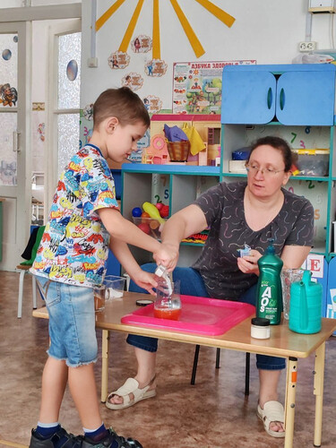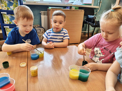 В День российской науки малыши из группы №5 приготовили «Разноцветную водичку». В прозрачные стаканы с водой они добавляли гуашь синего, жёлтого, красного и зелёного цветов.